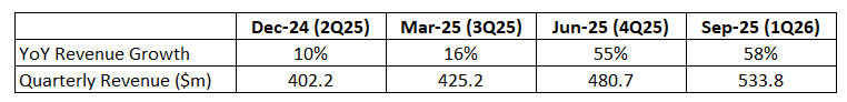 LITE reported record quarterly revenue of $533.8m, up 58% year over year and well ahead of expectations — its fastest growth in a decade. Guidance for next quarter sits between $630–$670m (midpoint ~$650m - an annualized QoQ growth of 120%), meaning the company will surpass its $600m-per-quarter target two quarters earlier than originally planned. Cloud and AI infrastructure now account for over 60% of revenue, with strong demand for next-generation laser components driving both higher utilization and margin expansion.