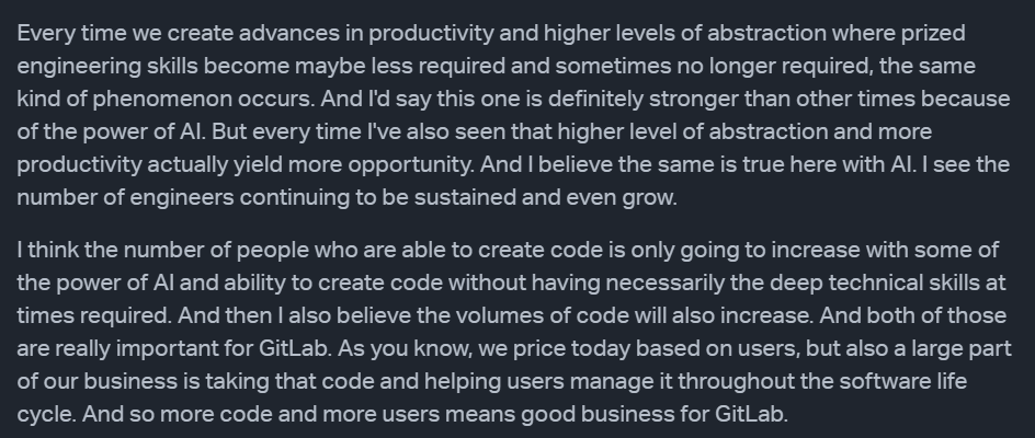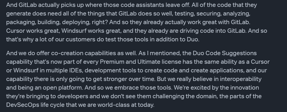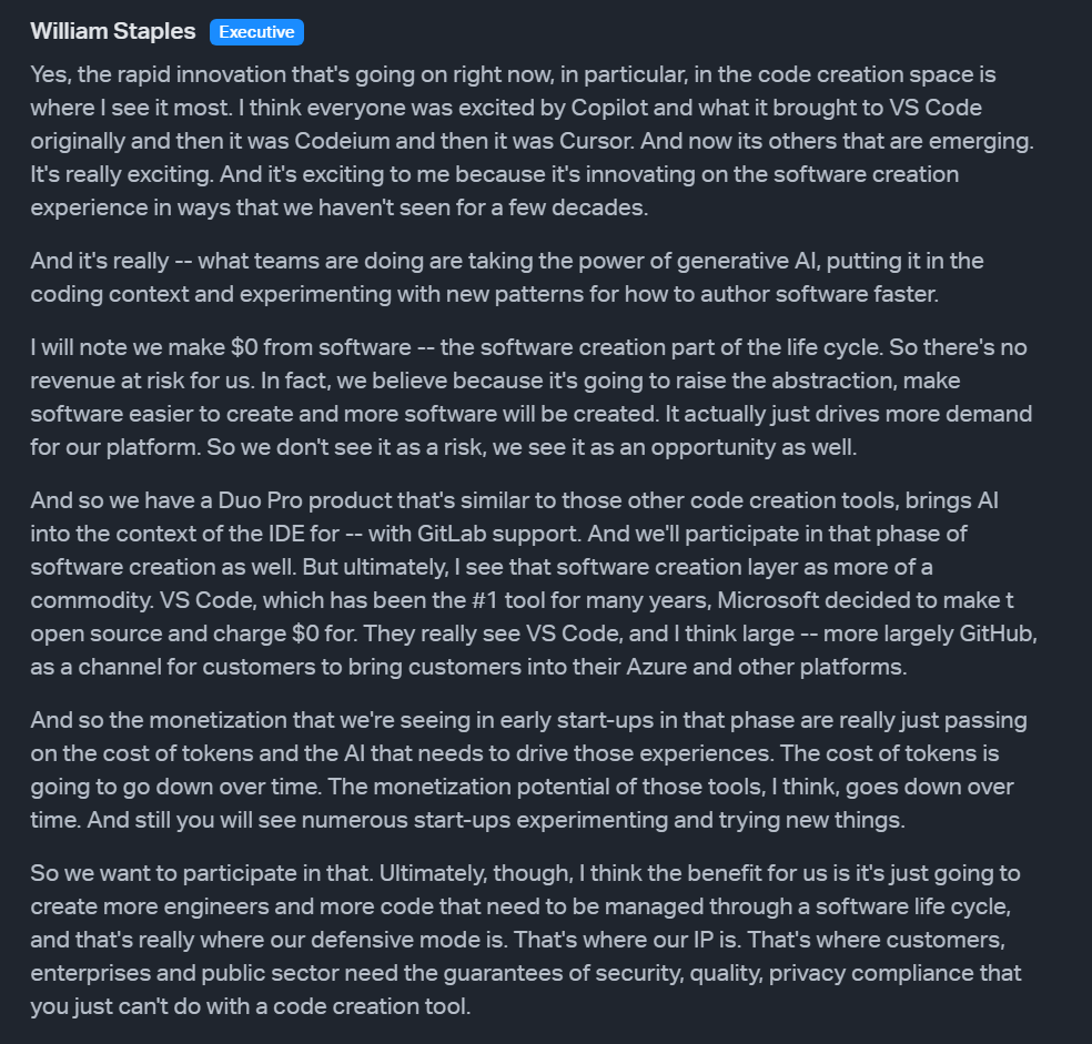 The current GitLab (GTLB) CEO believes that AI codegen copilots will expand the pool of developers and increase the amount of code written, which in turn should benefit GTLB as a downstream player in the software lifecycle. His argument, as reflected in his public remarks, is that more code means more need for platforms like GitLab to manage, test, secure, and deploy that code. He downplays the value and sophistication of AI IDEs, suggesting they’re more of a commodity layer, and reiterates that GitLab also offers AI codegen through its own Duo product. In his view, GTLB’s “defensive mode” is to focus on the lifecycle management — security, compliance, collaboration — rather than compete head-on with the frontier codegen and agent tools.